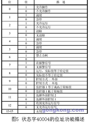 同時,通過對存儲寄存器40004(狀態(tài)字)讀取,可獲得變頻器的運(yùn)行狀態(tài)等信息,然后通過觸摸屏顯示界面,操作人員可以直觀地了解變頻器運(yùn)行信息.40004的位址內(nèi)容如圖5所示.