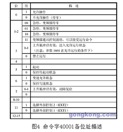 TVF2000的菜單參數(shù)被一一影射為MODBUS協(xié)議的寄存器,MODBUS通訊對各寄存器的操作,即實現(xiàn)了對TVF2000中與寄存器對應(yīng)的菜單參數(shù)的操作.對應(yīng)的命令寄存器為40001,其中每一位控制的具體內(nèi)容如圖4所示.