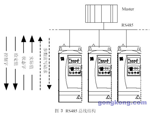 時代TVF2000系列變頻器可通過串行RS485總線與外部PLC控制系統(tǒng)進(jìn)行通訊,通訊協(xié)議為MODBUS的RTU形式,其控制命令和給定頻率全 部來自MODBUS通訊,其RS485總線結(jié)構(gòu)如圖3所示。TVF2000變頻器的寄存器40001為控制字,寄存器40002為給定值1,寄存器 40004為狀態(tài)字,寄存器40005為實際值。其相關(guān)參數(shù)設(shè)置如下: