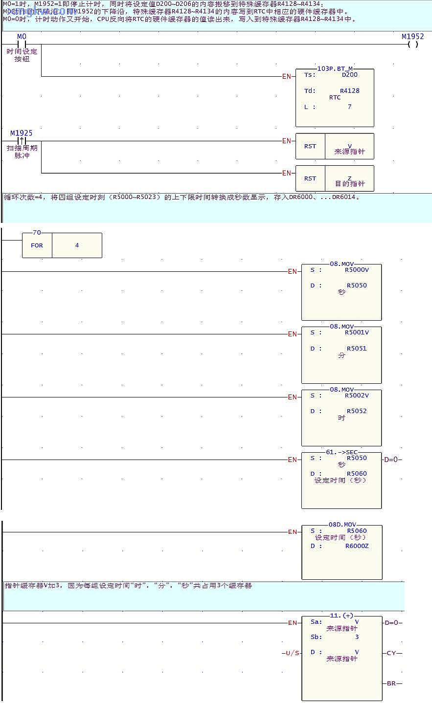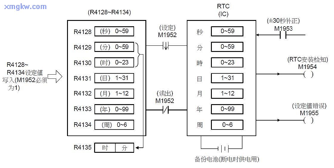 在M1952 由1→ 0 瞬間將 R4128~ R4134的設(shè)定值寫到 RTC中相對(duì)應(yīng)的硬件緩存器中。在M1952回到0 后計(jì)時(shí)動(dòng)作開(kāi)始,同時(shí)每次掃描 CPU 將反向地將 RTC中的時(shí)間值讀出,寫到 R4128~ R4134 去。