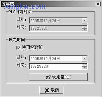 (2)時(shí)間的設(shè)定,也可以在 WinProladder界面中方便實(shí)現(xiàn):點(diǎn)選菜單“PLC”?“設(shè)定”?“萬(wàn)年歷”,即可出現(xiàn)下列窗口: