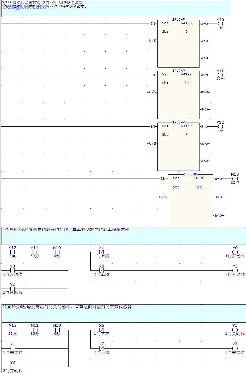 PLC萬(wàn)年歷當(dāng)前時(shí)間與設(shè)定時(shí)間,實(shí)現(xiàn)倉(cāng)庫(kù)門(mén)自動(dòng)控制功能。其中程序行 N000~N003為比較指令,若把設(shè)定值存放在緩存器中,結(jié)合人機(jī)界面,即可隨意把任意時(shí)間值(精確到秒)設(shè)定為倉(cāng)庫(kù)門(mén)開(kāi)閉時(shí)刻。