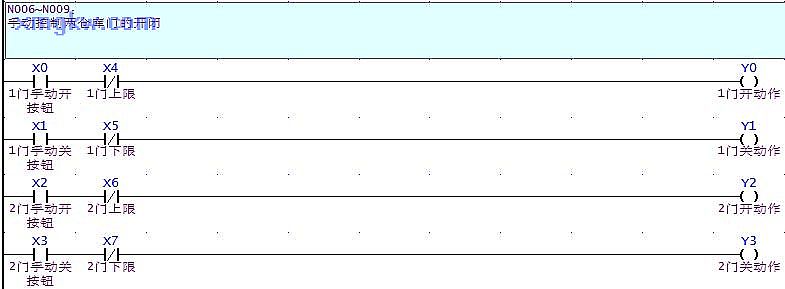 Y0=ON時(shí),電機(jī)正轉(zhuǎn), ?倉(cāng)庫(kù)門(mén)執(zhí)行開(kāi)門(mén)動(dòng)作,直至碰到上限傳感器 (X4=ON),Y0 變?yōu)?/span>OFF,打開(kāi)動(dòng)作才停止;當(dāng) Y1=ON時(shí),電機(jī)反轉(zhuǎn), ?倉(cāng)庫(kù)門(mén)執(zhí)行關(guān)門(mén)動(dòng)作,直至碰到下限傳感器( X5=ON), Y1變?yōu)?/span>OFF,關(guān)門(mén)動(dòng)作停止; ?倉(cāng)庫(kù)門(mén)的開(kāi)關(guān)門(mén)動(dòng)作與 ?倉(cāng)庫(kù)門(mén)完全相同。