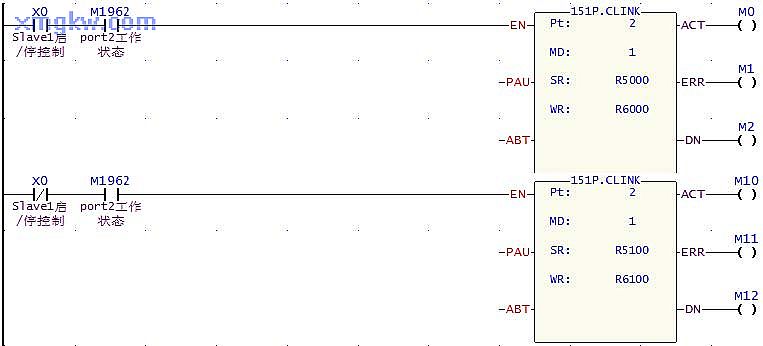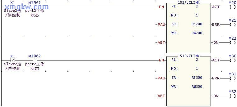 1. X0,X1兩個開關(guān)的 ON/OFF狀態(tài)分別對應(yīng)兩臺 slave PLC的run/stop,因此在程序中用這四個狀態(tài)啟動 4個 CLINK指令,發(fā)送通訊命令,即可達到控制要求。