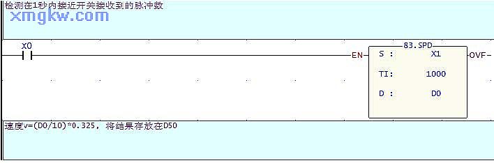 SPD 指令測(cè)得的接近開關(guān)的脈沖頻率( D0)來計(jì)算出電機(jī)的轉(zhuǎn)速。電機(jī)轉(zhuǎn)速 (r/min)=每分鐘內(nèi)測(cè)得的脈沖數(shù)目 /10=(脈沖頻率 ×60)/10=(D0×60)/10。
