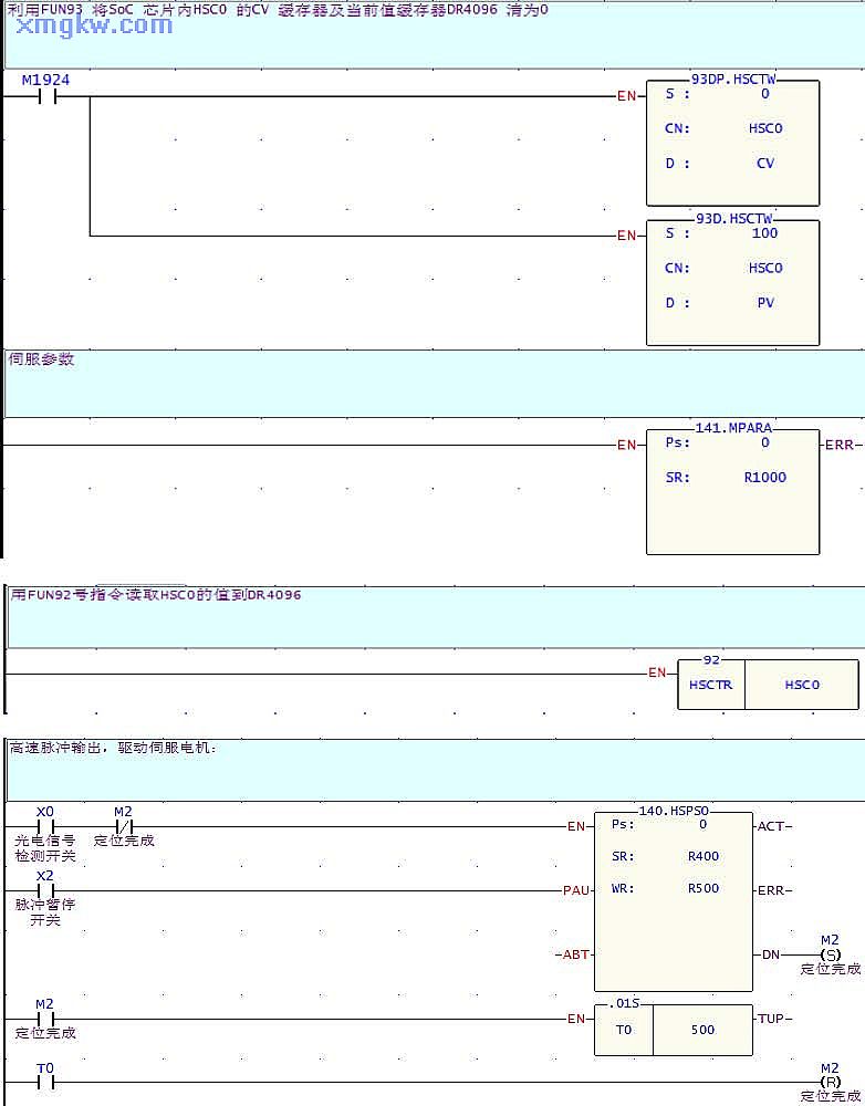 當(dāng)啟動(dòng)開(kāi)關(guān)閉合后, X1=ON,伺服電機(jī)開(kāi)始以 0.1r/s(SPD=1000Hz)的速度開(kāi)始旋轉(zhuǎn),經(jīng)過(guò) 200ms 的勻加速后,轉(zhuǎn)速增加到 1r/s(SPD=10000Hz),快到達(dá)目標(biāo)位置時(shí),又以相同的方式作勻減速動(dòng)作,到達(dá)目標(biāo)位置后,伺服電機(jī)停止運(yùn)轉(zhuǎn)。