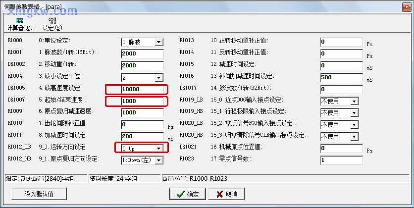 在伺服參數(shù)表格中,設(shè)定 “起始/結(jié)束速度 ”為1000,“最高速度”為10000,“加減速時(shí)間 ”為200ms。