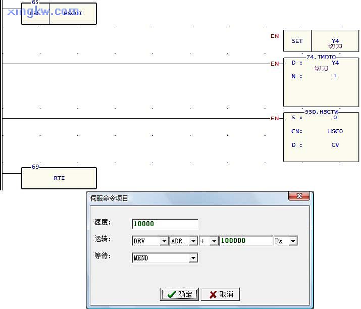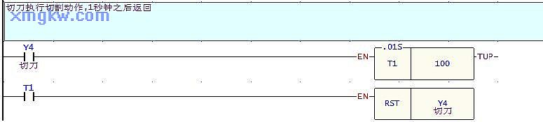 由于伺服電機(jī)每旋轉(zhuǎn)一周,接近開(kāi)關(guān)會(huì)接收到 10個(gè)脈沖信號(hào),當(dāng)伺服電機(jī)到達(dá)目標(biāo)位置時(shí),接近開(kāi)關(guān)會(huì)接收100個(gè)脈沖信號(hào),產(chǎn)生中斷信號(hào) “HSC0I”,執(zhí)行相應(yīng)的中斷程序,切刀執(zhí)行切割動(dòng)作, 1 秒鐘后切刀返回,再過(guò) 3秒之后,伺服電機(jī)執(zhí)行下一次定位動(dòng)作。