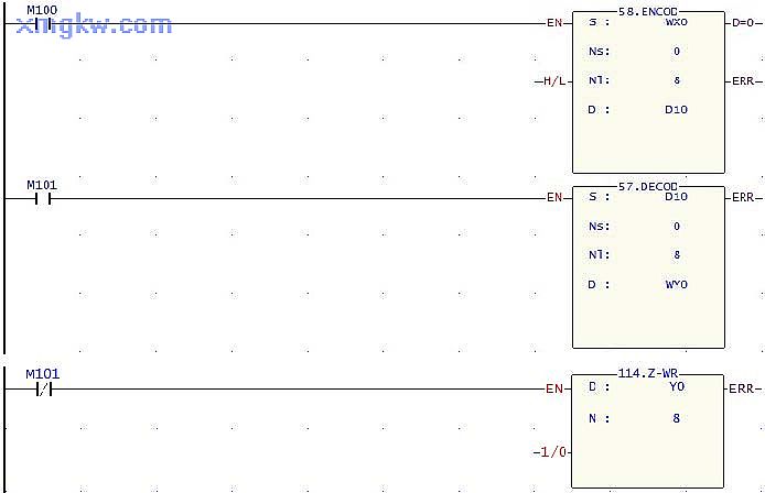M101= ON,執(zhí)行 DECOD指令,設(shè)置 D10的值, D10的值會(huì)被譯碼到 Y0~Y7中之一,從而使對(duì)應(yīng)的輔助流水線暫停,例如, D0=5,則譯碼得到 Y5=ON,編號(hào) 5的輔助流水線將暫停運(yùn)行;當(dāng) M101=OFF, Z-WR指令執(zhí)行, Y0~Y7都為OFF,所有的流水線都正常運(yùn)行。