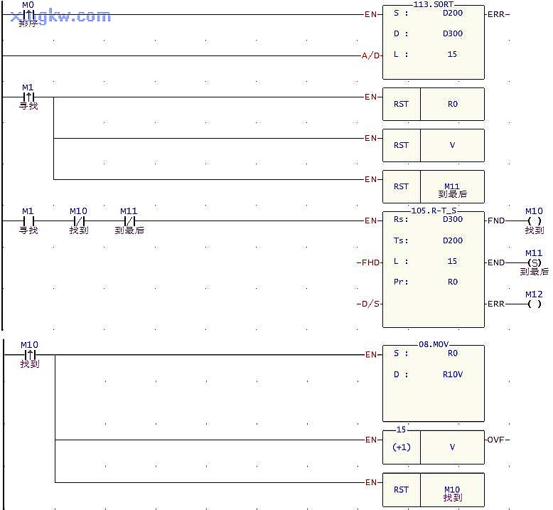 1.排序命令按鈕 M0由OFF→ON,即對存儲在 D200~D214的15個(gè)數(shù)據(jù)進(jìn)行由小到大的排序,將結(jié)果存放到 D300~D314中。
