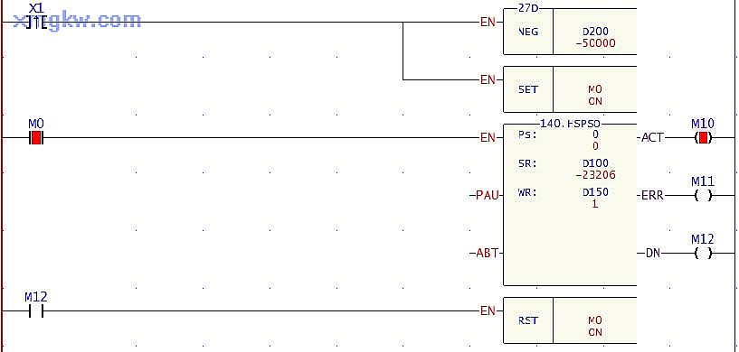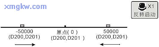 【控制要求】某定位控制系統(tǒng)做左右位移運動,每按下一次按鈕( X1),定位裝置從當前位置反轉移動到以原點( D200, D201值為0)為對稱中心的另一邊。