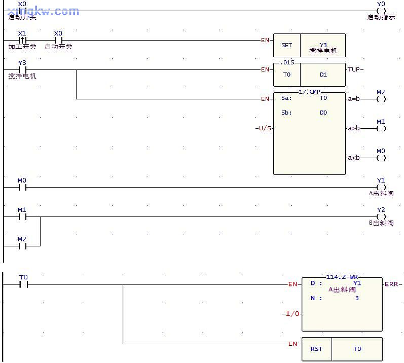 當(dāng)按下加工按鈕后, X1由 OFF→ON變化, SET指令被執(zhí)行,且 Y3被置位,則攪拌電機(jī)不停轉(zhuǎn)動(dòng),而且 T0開(kāi)始計(jì)時(shí)。