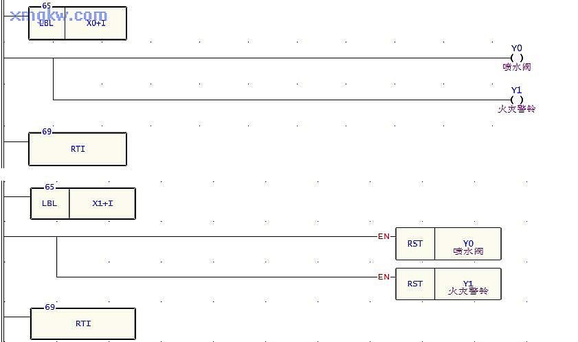 當警報解除時,按下警報解除按鈕, X1由OFF→ON變化,PLC 立即停止主程序執(zhí)行,轉而執(zhí)行中斷子程序“X1+I”,關閉噴水閥( Y0)和警鈴( Y1);“ X1+I”執(zhí)行完畢后,再返回主程序從斷點處繼續(xù)往下執(zhí)行。