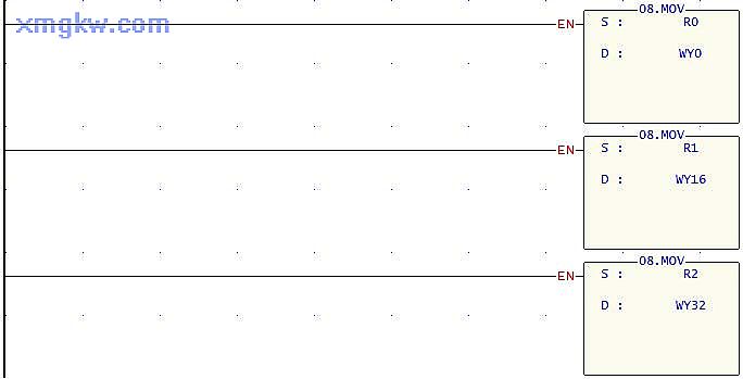 本例中利用指針緩存器來實現(xiàn)將單一值裝入一個緩存堆棧(連續(xù) R區(qū)域),用戶可以根據(jù)自己需要來使用這個區(qū)域的數(shù)據(jù),比如用于定時器,計數(shù)器等方面的控制。
