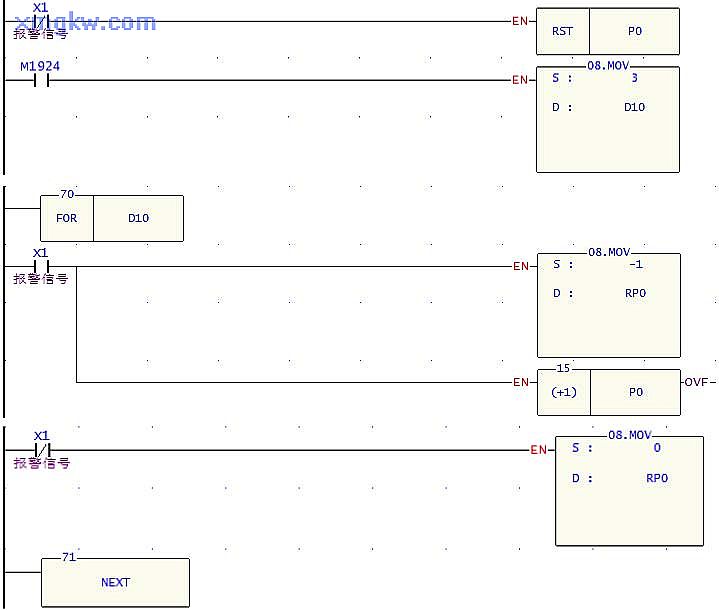 2. P0=0時,RP0代表R0;P0=1時,RP0代表R1;P0=2時,RP0代表R2。當警報響時, X0=ON,F(xiàn)OR~NEXT循環(huán)執(zhí)行3次,F(xiàn)FFFH被依次送到 R0~R2中,F(xiàn)OR~NEXT循環(huán)執(zhí)行完畢后, R0~R2的值被送到外部 Y輸出點,所有 Y輸出被置位為 ON,將每個錢柜抽屜鎖住。