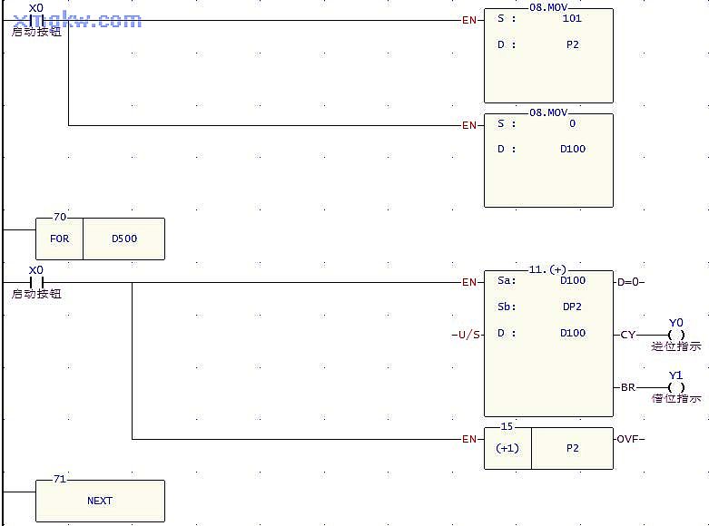 當(dāng)相加結(jié)果數(shù)值小于 -32768時,BR接通,輸出線圈Y1導(dǎo)通,借位指示燈亮;當(dāng)相加結(jié)果數(shù)值大于 32767時,CY接通,輸出線圈 Y0導(dǎo)通,進(jìn)位指示燈亮。