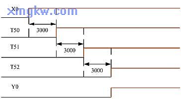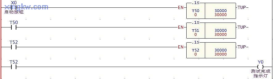 當按下啟動按鈕后, X0=ON,定時器 T50開始計時,經過 100ms×30000=3000s后,T50常開接點導通, T51開始計時,又經過 100ms×30000=3000s后, T51常開接點導通, T52開始計時,再經過 100ms×30000=3000s后,T2常開接點導通, Y0=ON,老化測試完成指示燈點亮。老化測試的總時間為 3000s + 3000s + 3000s = 9000s =150分鐘 =2.5小時。