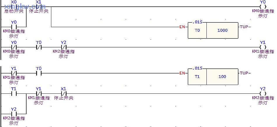 2. T0計(jì)時(shí)器到達(dá) 10秒預(yù)設(shè)值后, T0=ON,Y1=OFF,T1計(jì)時(shí)器開始計(jì)時(shí),到達(dá) 1s預(yù)設(shè)值后, T1=ON,所以 Y2=ON,三角形正常運(yùn)行接觸器 KM2導(dǎo)通。