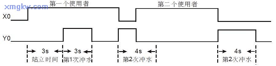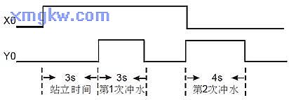 M1形成了一個(gè)自保電路。當(dāng)使用者站立時(shí)間超過(guò) 3秒才離開(kāi)(常開(kāi)接點(diǎn) M0=ON、常閉接點(diǎn) X0=ON)時(shí), M1保持為 ON。開(kāi)始第二次沖水( Y0=ON),直到?jīng)_水 4秒后( T2的常開(kāi)接點(diǎn)閉合,常閉接點(diǎn)斷開(kāi)),停止沖水( Y0=OFF),M0、M1被復(fù)位。