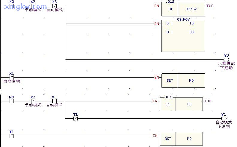 將開關(guān)旋轉(zhuǎn)到自動(dòng)模式時(shí), X3=ON,每啟動(dòng)一次自動(dòng)沖壓, X1一直為ON,所以 Y1=ON,開始執(zhí)行沖壓,同時(shí)定時(shí)器 T1開始執(zhí)行,到達(dá)預(yù)設(shè)值(其值大小為 D0中內(nèi)容值)后, T1常開接點(diǎn)導(dǎo)通,所以 Y1=OFF,沖壓停止, M0被復(fù)位為OFF,下一次觸發(fā)沖壓時(shí), M0又變?yōu)镺N,又重復(fù)執(zhí)行上一次沖壓的過(guò)程。