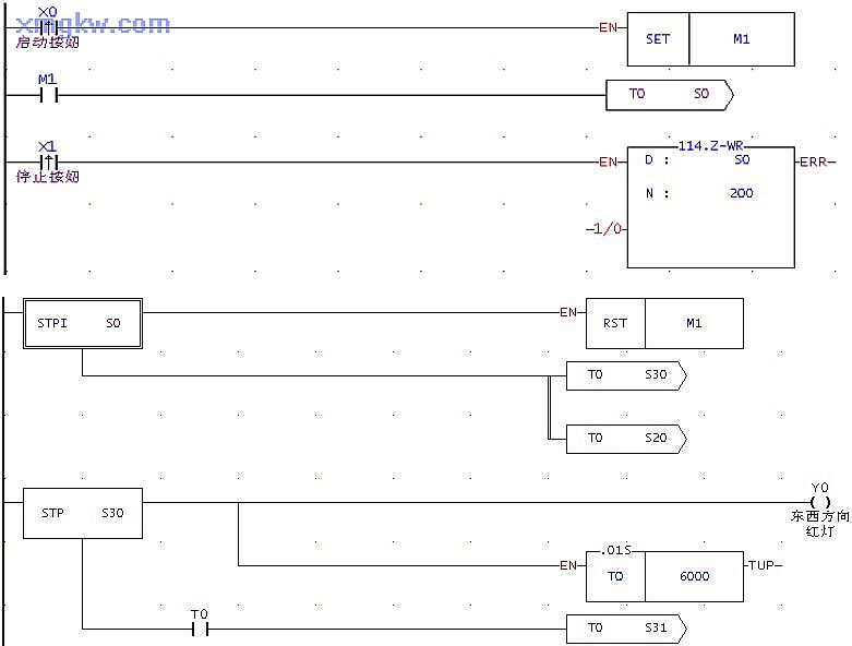 X1由 OFF→ON動作, X1產生一個上升沿脈沖, [Z-WR S0 S200]指令被執(zhí)行,所有的步進點被復位,所有交通燈熄滅。