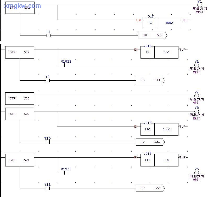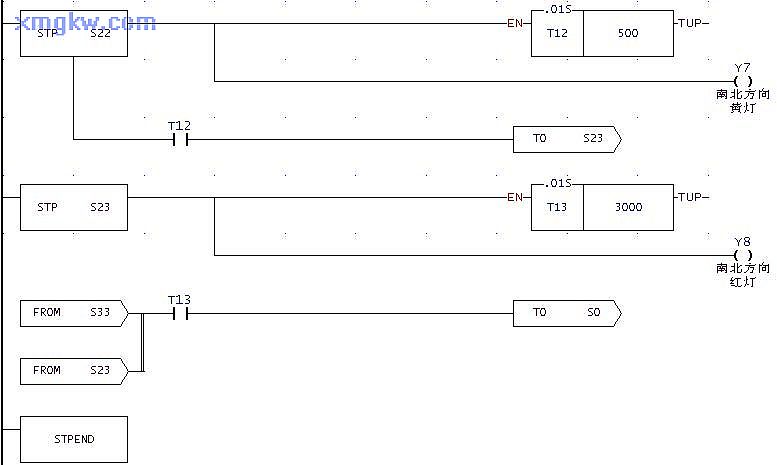 東西方向的黃燈亮時間( Y2)并沒有用定時器來控制,這是因為當南北方向紅燈亮時間結束后(同時也是東西方向黃燈結束時間), T13=On,在 S33 和 S23 都為 On 的狀態(tài)下,返回到步進點 S0,S33 和 S23 步進點對應的 Y狀態(tài)被復位, Y2自然也被復位。