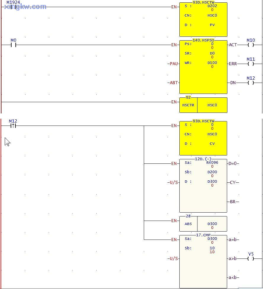 3. M12=ON,F(xiàn)UN93也被執(zhí)行, HHSC0的當(dāng)前計(jì)數(shù)值 CV(DR4096)被清零,保證 PLC在下一次對(duì)輸入脈沖計(jì)數(shù)時(shí),又開(kāi)始從 0開(kāi)始進(jìn)行計(jì)數(shù)。