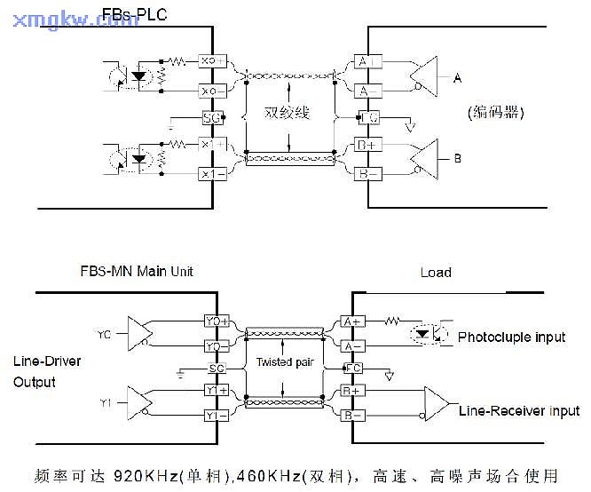因?yàn)樗欧幋a器輸出信號(hào)為差分信號(hào),所以本范例需使用支持差分信號(hào)輸入的 FBs-MN機(jī)種(其 X0-X7支持差動(dòng)輸入, Y0-Y7支持差動(dòng)輸出)。