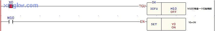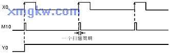 開關(guān)由 OFF→ON動作時產(chǎn)生一個掃描周期的脈沖 M10,作為條件去觸發(fā)指示燈或其他裝置?!窘M件說明】